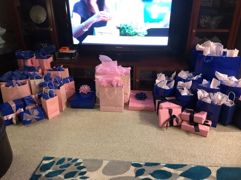 A fully styled prize table stacked with gift bags and wrapped boxes instantly makes guests curious — and maybe just a little competitive.
