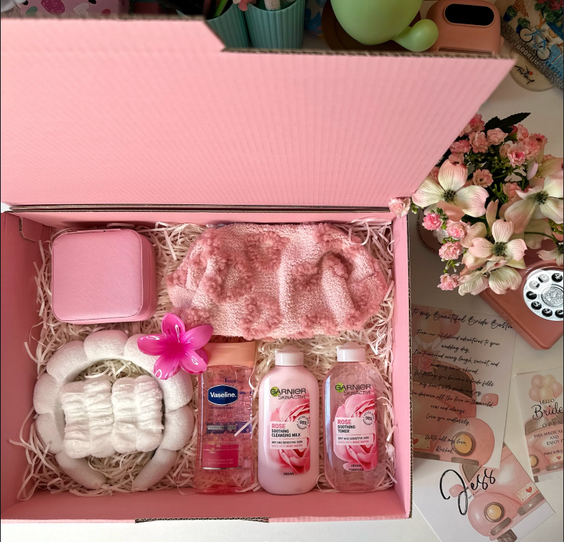 A curated pink self-care box filled with skincare, beauty essentials, and cozy accessories instantly feels thoughtful and indulgent.