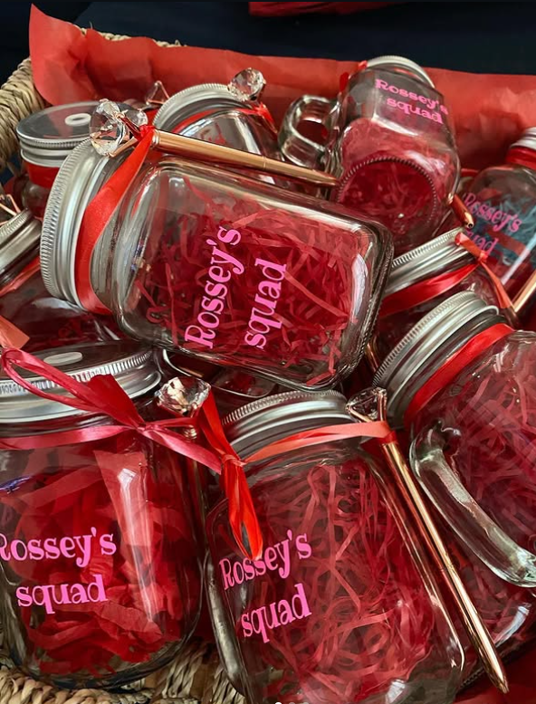 Personalized mason jars with “Rosé Squad” (or your own custom phrase) instantly set the tone and make the whole shower feel cohesive and fun.