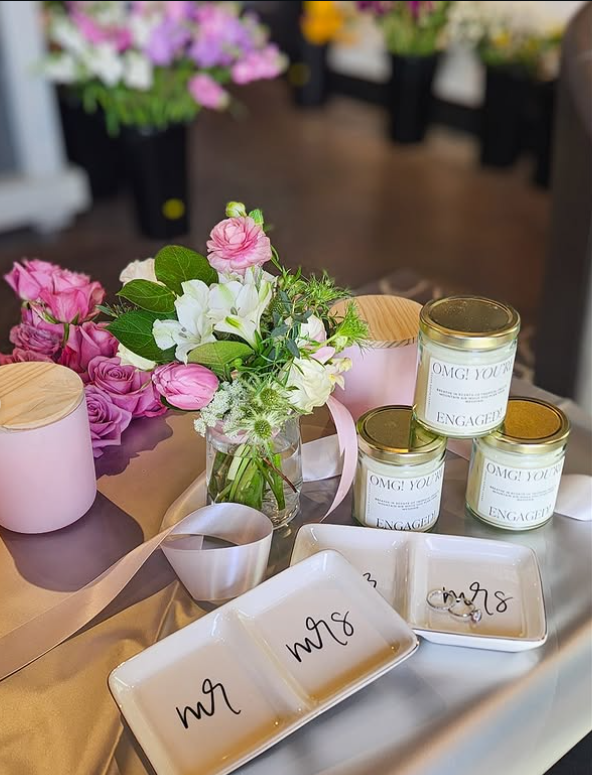 “Mr & Mrs” ring dishes paired with soft pink candles and fresh florals instantly make your prize table feel elegant and curated.