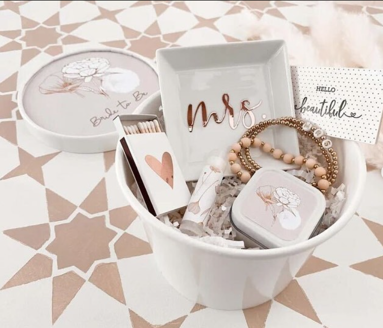 A curated little bowl filled with bride-inspired trinkets — think a “Mrs.” dish, delicate jewelry, pretty matches, and thoughtful mini accessories — feels personal and beautifully put together.