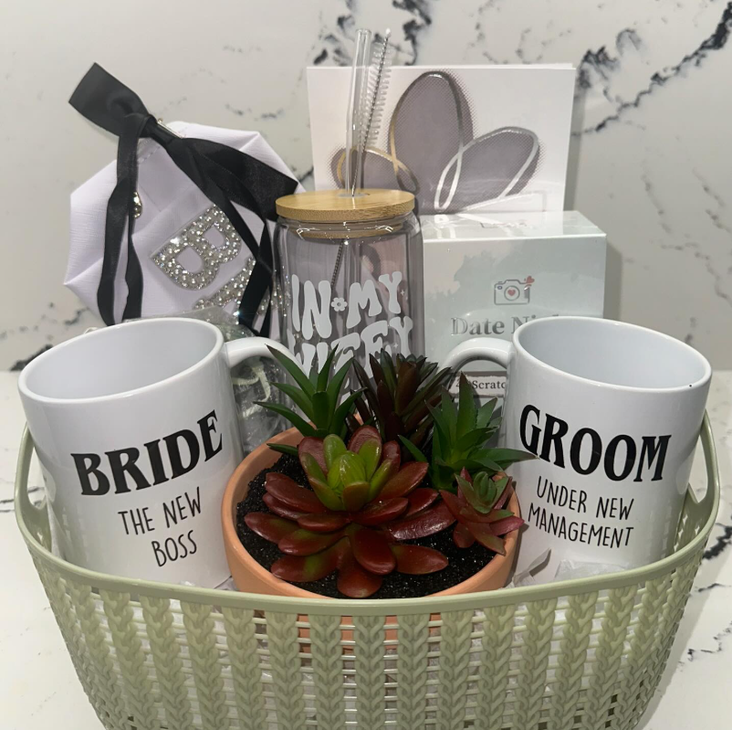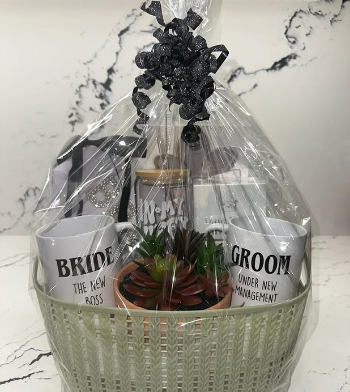 A curated basket featuring matching “Bride” and “Groom” mugs, paired with thoughtful little extras and wrapped beautifully in cellophane, instantly feels like a standout prize on your table.