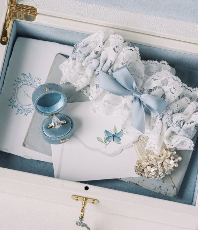 A delicate lace garter with a soft blue bow, paired with elegant keepsakes in a beautiful presentation box, instantly captures that timeless “something blue” tradition.
