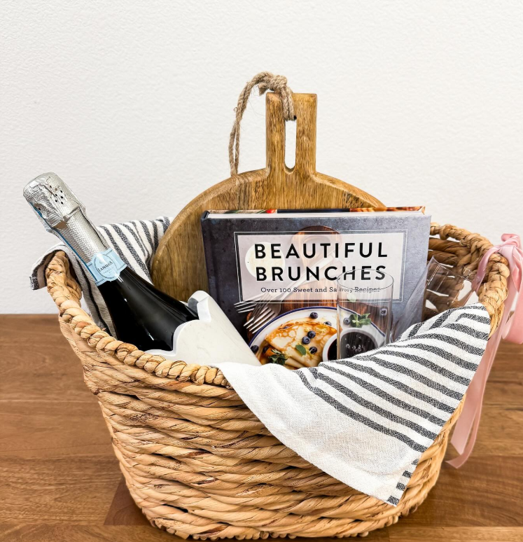 A woven basket filled with a beautiful brunch cookbook, a bottle of bubbly, and a stylish serving board instantly feels thoughtful and elevated.