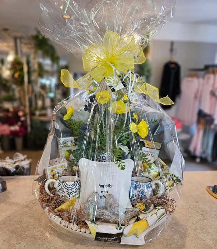 A thoughtfully arranged basket filled with tea, lemon-themed treats, pretty mugs, and soft florals instantly gives off that cheerful “new beginnings” energy. It feels light, happy, and perfectly celebratory.