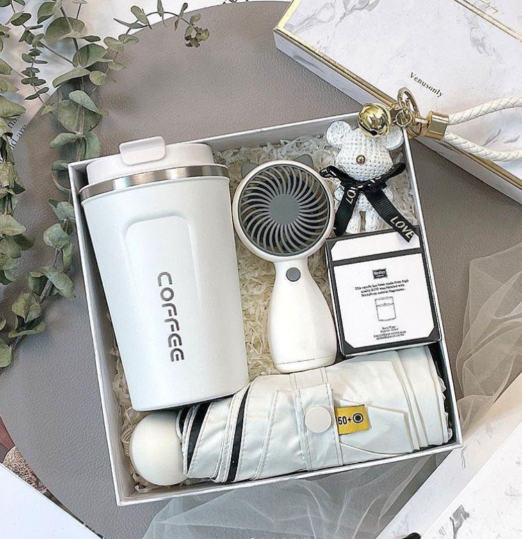 A sleek coffee tumbler, a mini portable fan, a cute keychain accessory, and thoughtful little add-ons all tucked neatly into a gift box?