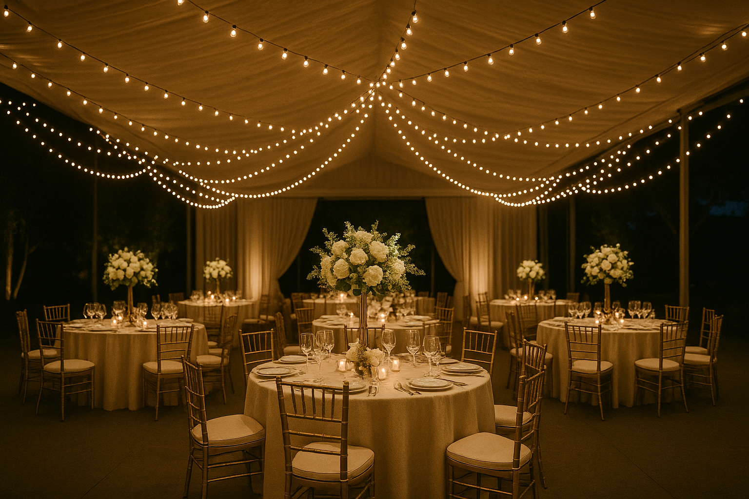 Imagine celebrating your special day outside, surrounded by the beauty of nature and a sky full of stars. An outdoor wedding reception creates a magical setting that feels intimate and inviting. The image captures a stunning reception area, beautifully lit for a night under the stars.
