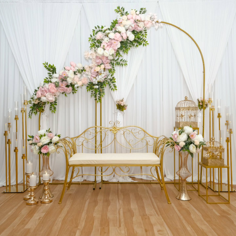 The soft pink and ivory blooms cascading across the gold frame instantly create a romantic focal point, while the sheer white draping keeps everything light, airy, and sophisticated.
