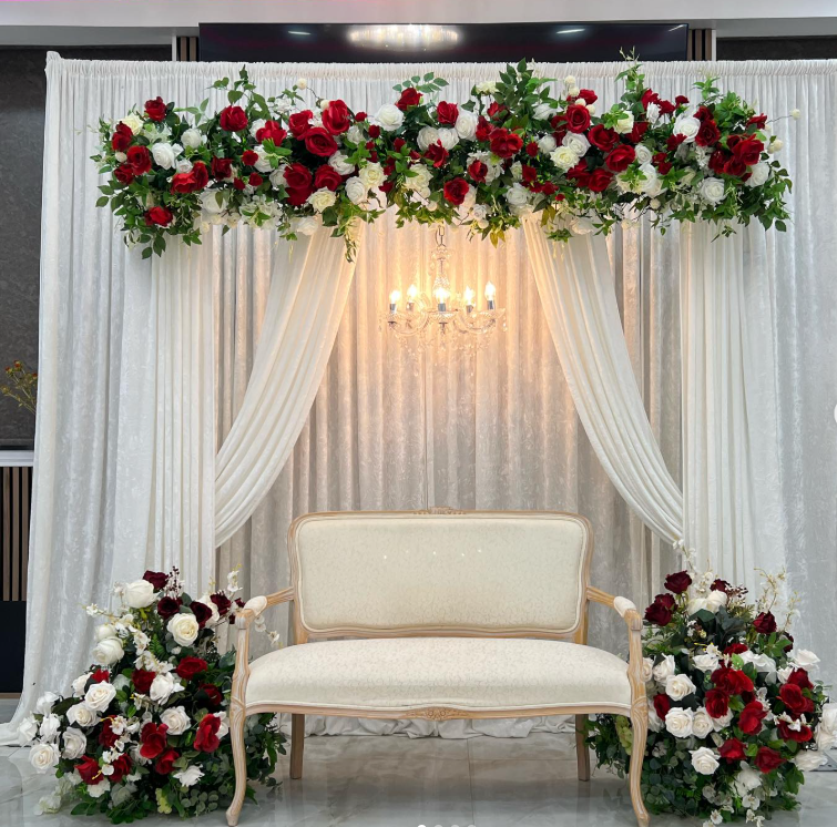 If you’re going for timeless romance with a dramatic twist, this red and white rose backdrop is absolutely stunning.