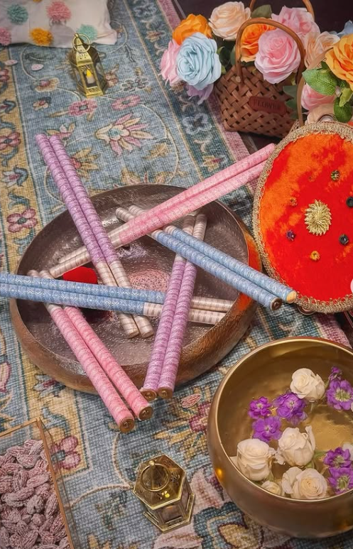 The soft pastel bangles displayed in a rustic tray, paired with floating florals, lantern accents, and woven baskets of blooms, instantly create a warm and inviting atmosphere.