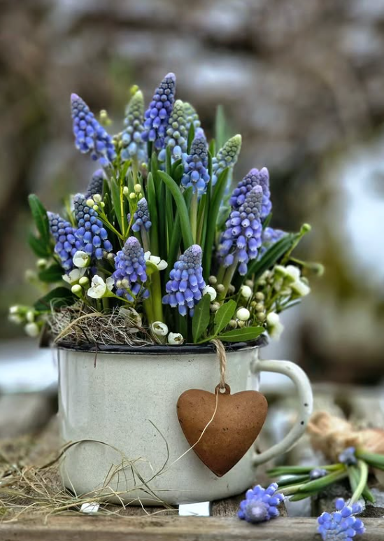 The soft purple blooms arranged inside a rustic enamel mug feel effortless and heartfelt, while the tiny hanging wooden heart adds a personal, handmade touch.