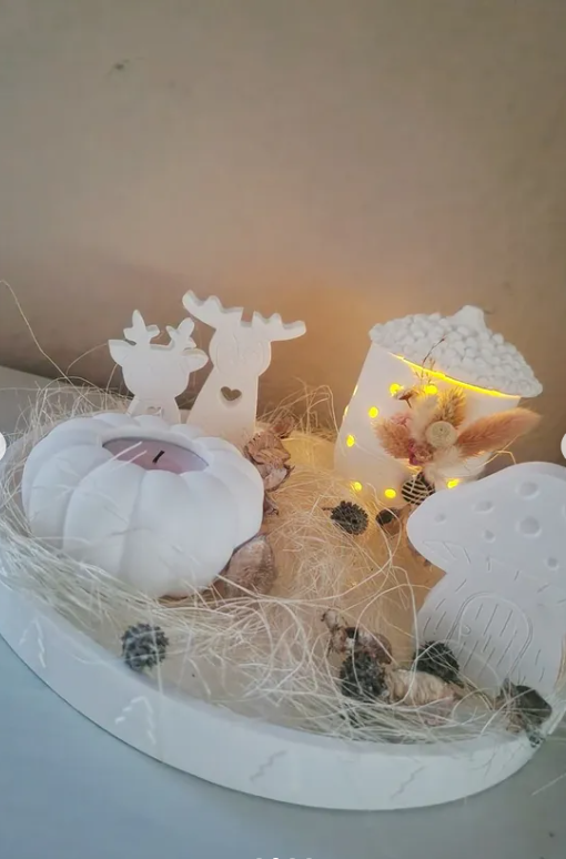 The neutral white pumpkins, delicate wooden deer silhouettes, and textured mushrooms create a cozy, storybook feel that’s both elegant and understated.