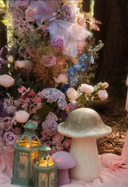 Start with a lush floral arrangement as your base, then layer in unexpected elements like decorative mushrooms, pastel lanterns, and soft draped fabric for texture.
