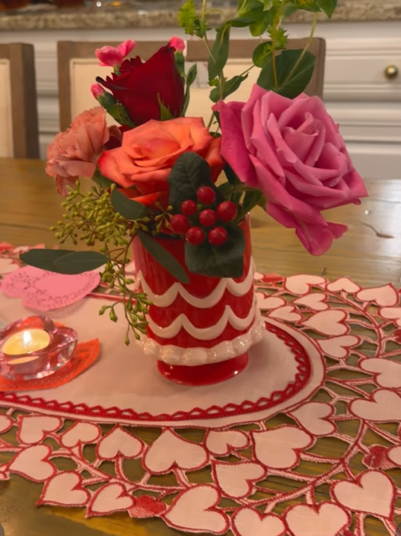The bold red and pink roses arranged in a patterned vase instantly bring warmth and charm to the table, while the heart-themed placemat ties everything together in the sweetest way.