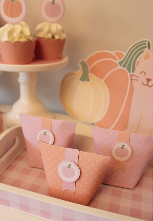 This is such an easy DIY bridal shower decoration idea. Use printable pumpkin cutouts, soft gingham trays, and pastel favor boxes to keep everything cohesive.