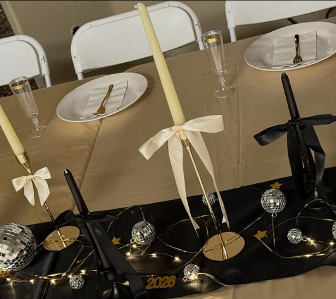 The sleek candle holders wrapped with soft ribbon bows bring just the right balance of elegance and drama, while the gold accents and subtle fairy lights add warmth and glow.