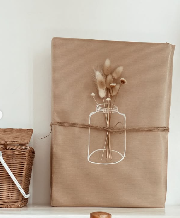 Wrap presents or display boxes in brown kraft paper, secure them with jute string, and add small dried flower bundles for texture.