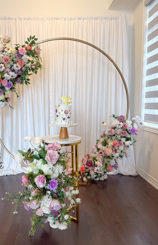 The oversized gold ring framed with cascading blush, ivory, and lavender blooms creates a soft, romantic focal point, while the elevated cake stand keeps everything feeling refined and intentional.