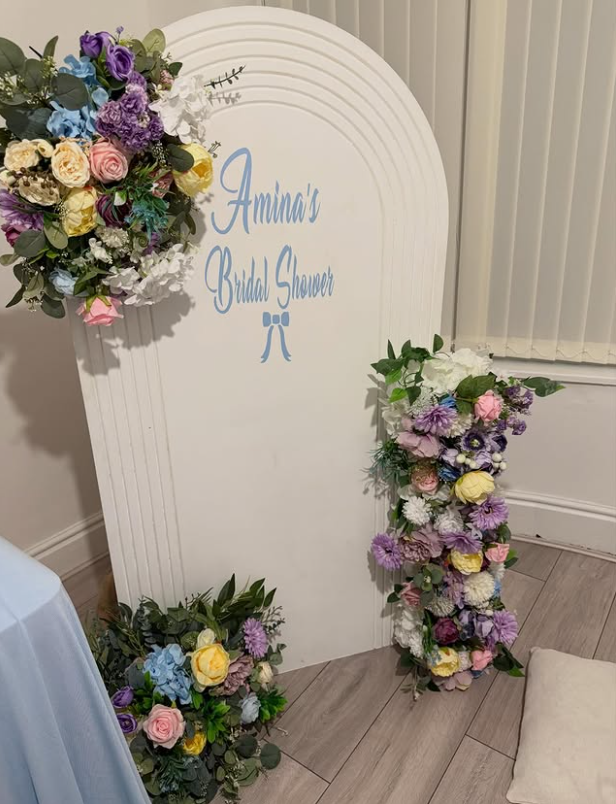This arched backdrop with soft pastel florals instantly sets the tone for the celebration, and adding the bride’s name in elegant script makes it feel intimate and thoughtfully planned.