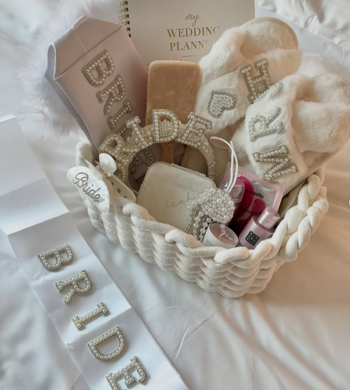 The soft ivory textures, pearl-studded “BRIDE” letters, cozy robe, and curated beauty essentials create a setup that feels elegant, personal, and completely pampered. It’s not just a gift — it becomes part of the décor.