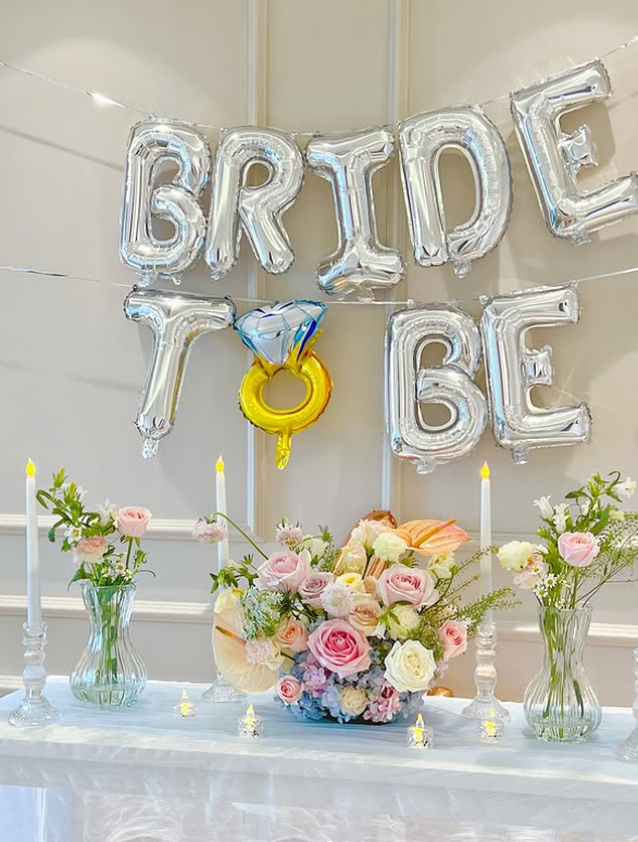 The oversized silver letter balloons paired with a sparkling ring accent create that classic bridal shower vibe, while the soft pastel florals and taper candles below keep the look elegant and balanced.