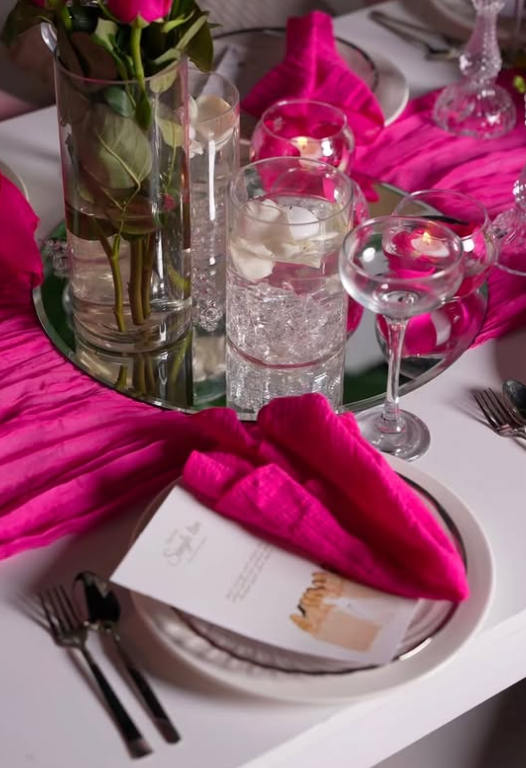 The bright fuchsia fabric woven through the center instantly adds drama, while the glass vases, floating candles, and elegant stemware keep the look sophisticated.