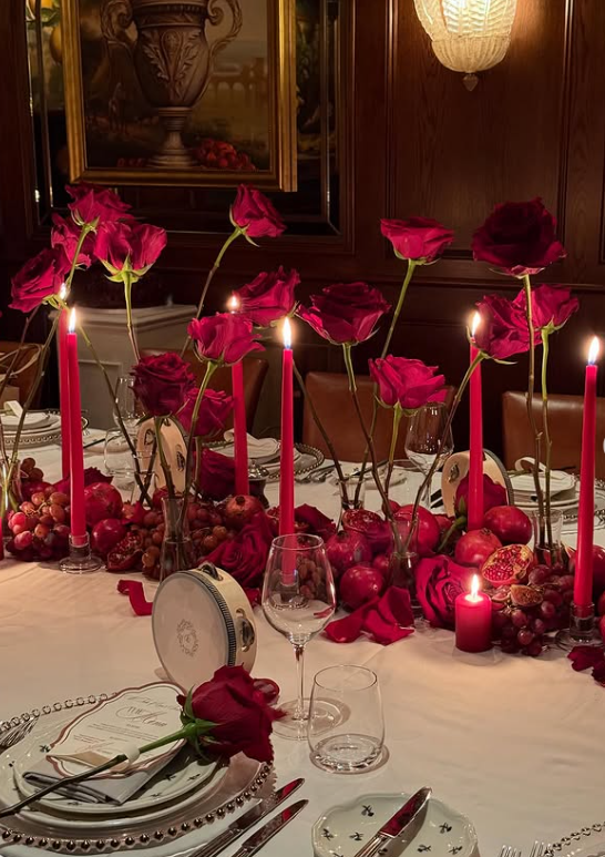 Layered with pomegranates, grapes, and scattered petals, the entire table feels lush, luxurious, and thoughtfully styled.