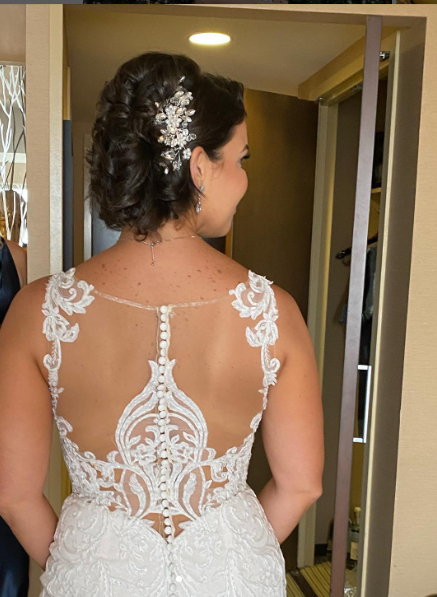 Adorned with a delicate floral hair accessory, this hairstyle adds a touch of sparkle and complements the intricate lace detailing of the bridal gown.
