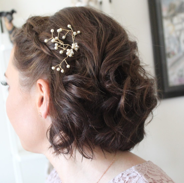 A delicate braid gracefully wraps around the side, adorned with a charming pearl hair accessory, adding a touch of sophistication and whimsy.