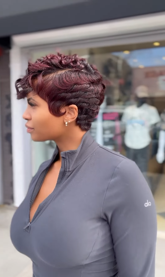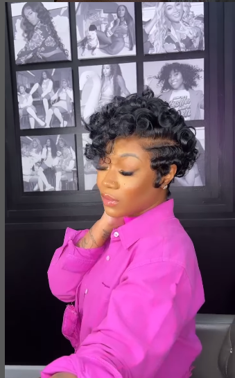 This stunning short hairstyle features beautifully defined waves, creating a textured and dynamic look.