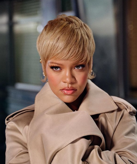The hair is styled close to the head with soft, feathered layers that add texture and movement.