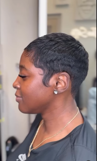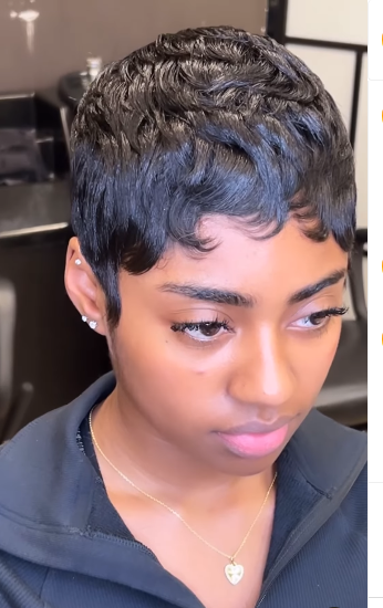This stunning pixie cut is styled with classic finger waves, creating a glossy and sculpted look that exudes vintage charm.