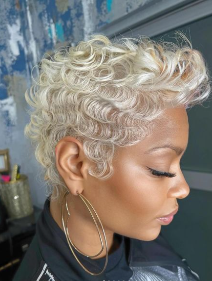 This stunning platinum curly crop is a radiant blend of vintage glamour and modern chic.