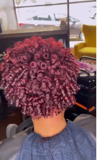 The deep burgundy hue adds a rich and dynamic dimension to the curls, making this hairstyle a striking statement.