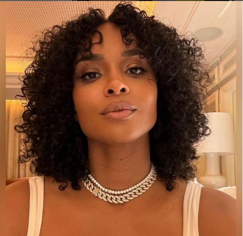 The hair is cut short, styled with soft, defined curls that add volume and texture.