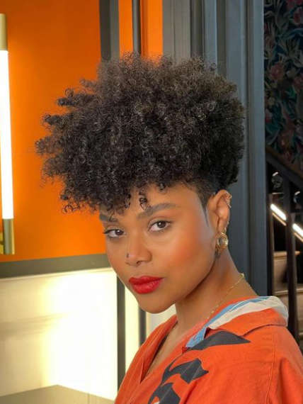 The hair is styled into tight, defined curls that create a full and voluminous afro.