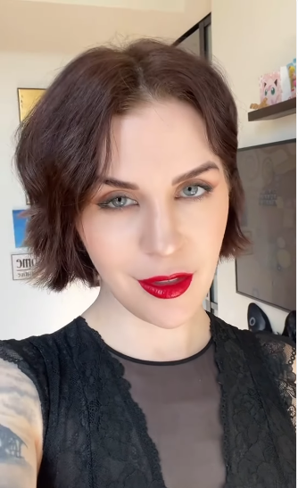 The hair is styled into soft, defined curls that fall gracefully around the shoulders, with the addition of chic, curly bangs that frame the face beautifully.