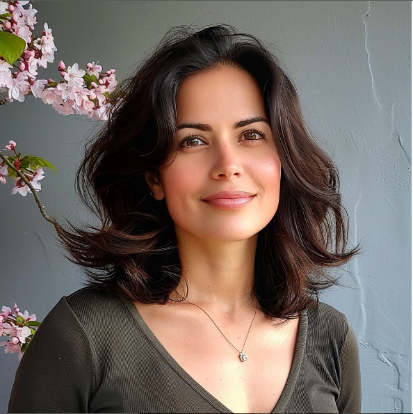 The hair is neatly styled with a slight lift at the crown, creating a subtle yet elegant shape.