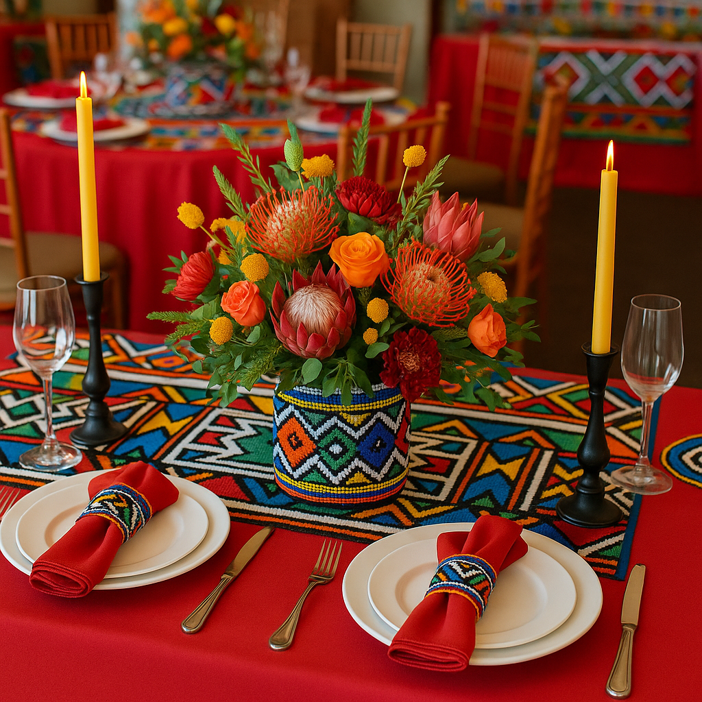 A beautifully decorated table with a Zululand-inspired table runner featuring colorful patterns and motifs.