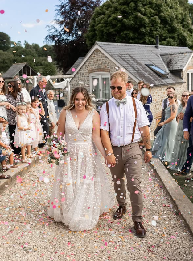 Walking hand-in-hand as newlyweds through a shower of colorful confetti, this moment radiates happiness, love, and celebration.