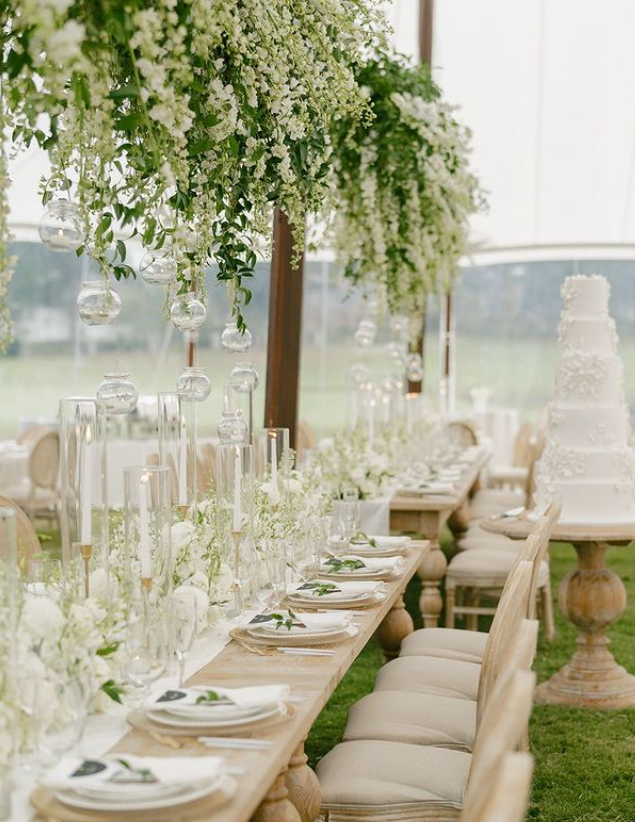 An ethereal blend of cascading greenery, soft candlelight, and refined table settings creates a dreamy reception scene.