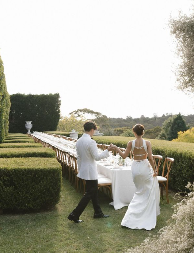 A long, elegant table set amidst perfectly manicured greenery creates an intimate and enchanting setting.