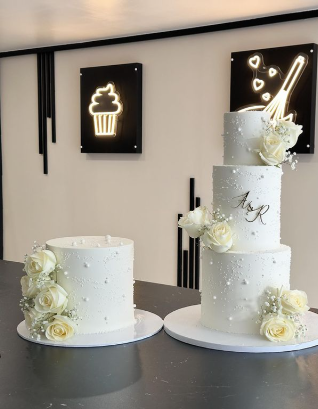 A perfect blend of simplicity and sophistication, this wedding cake features delicate pearl details and fresh white roses, making it a timeless centerpiece for your celebration.