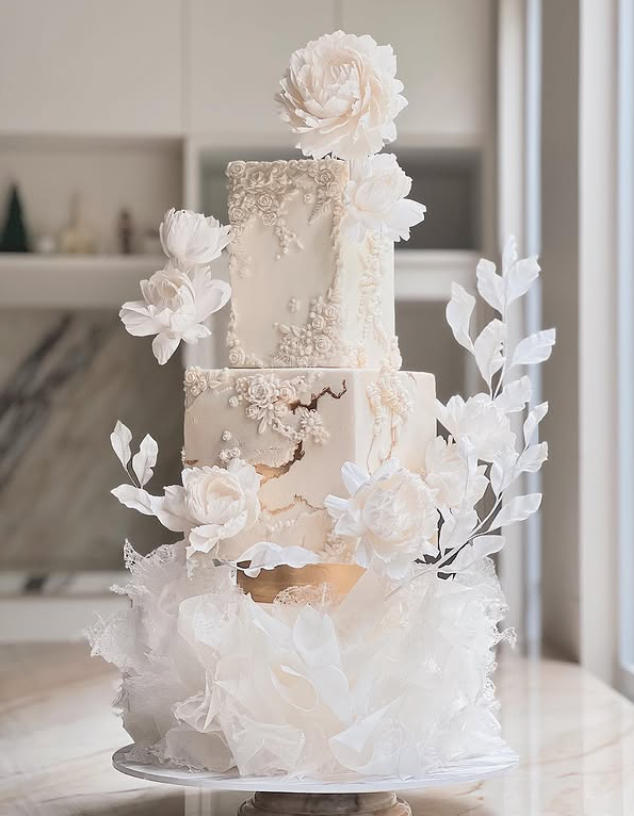Delicate florals and intricate textures make this wedding cake a true showstopper. With its soft ivory palette and elegant details, it perfectly balances sophistication and romance.