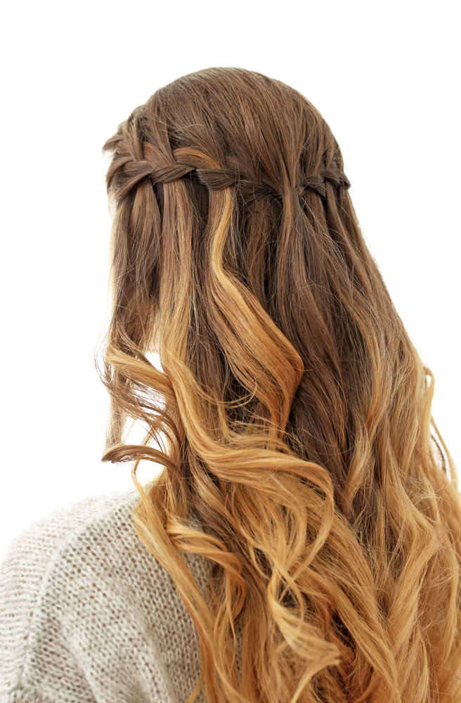 A waterfall braid is ideal for creating a lovely, romantic look. This look is perfect with a classic bridal gown!
