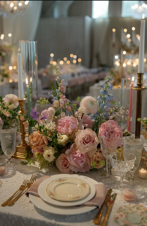 Featuring lush pastel florals, delicate tableware, and glowing candlelight, it creates a warm, intimate atmosphere your guests will instantly fall in love with.