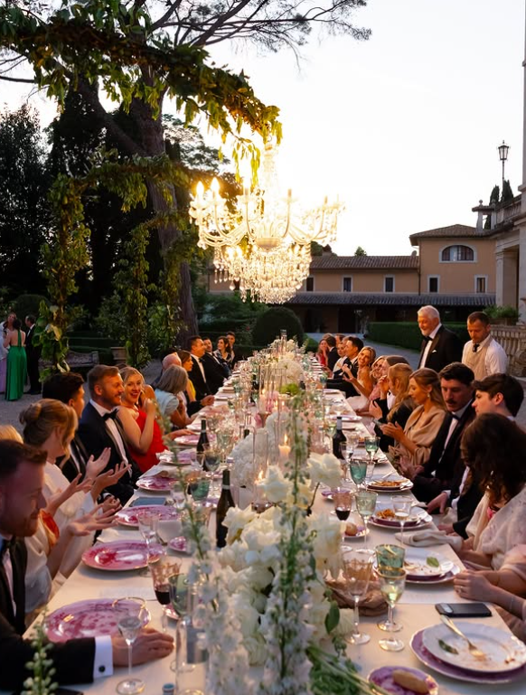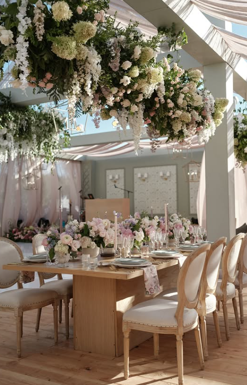 The delicate florals and refined table settings create a luxurious atmosphere, while the open-air setting keeps everything feeling light and fresh.