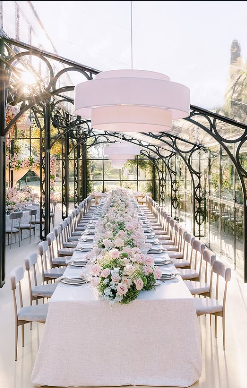 This stunning spring wedding reception idea blends modern design with soft romantic details inside a light-filled glasshouse setting.