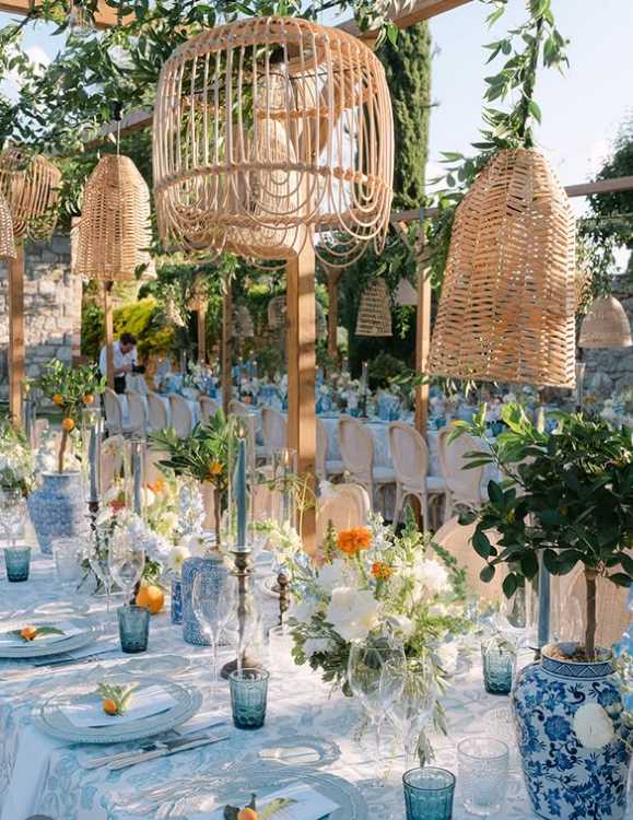 The mix of greenery, citrus accents, and soft table settings creates a lively yet elegant outdoor atmosphere that feels warm and inviting.