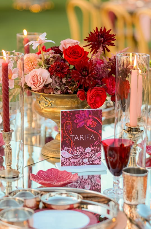 This spring wedding reception idea brings a bold and romantic twist with rich red florals, warm candlelight, and striking gold accents.
